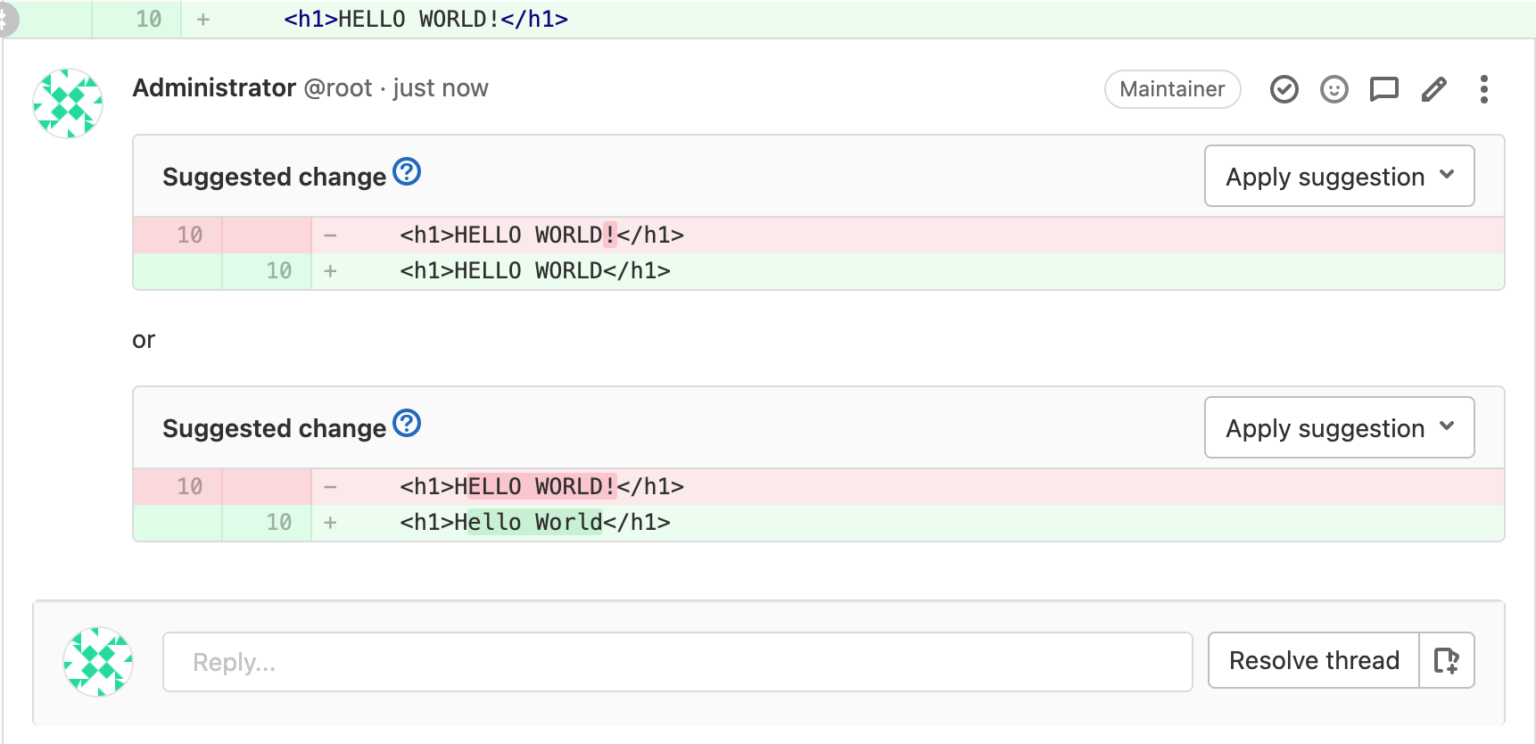Reviewers can also suggest changes to multiple lines with a single suggestion within merge request diff threads by adjusting the range offsets. The offsets are relative to the position of the diff thread, and specify the range to be replaced by the suggestion when it is applied.