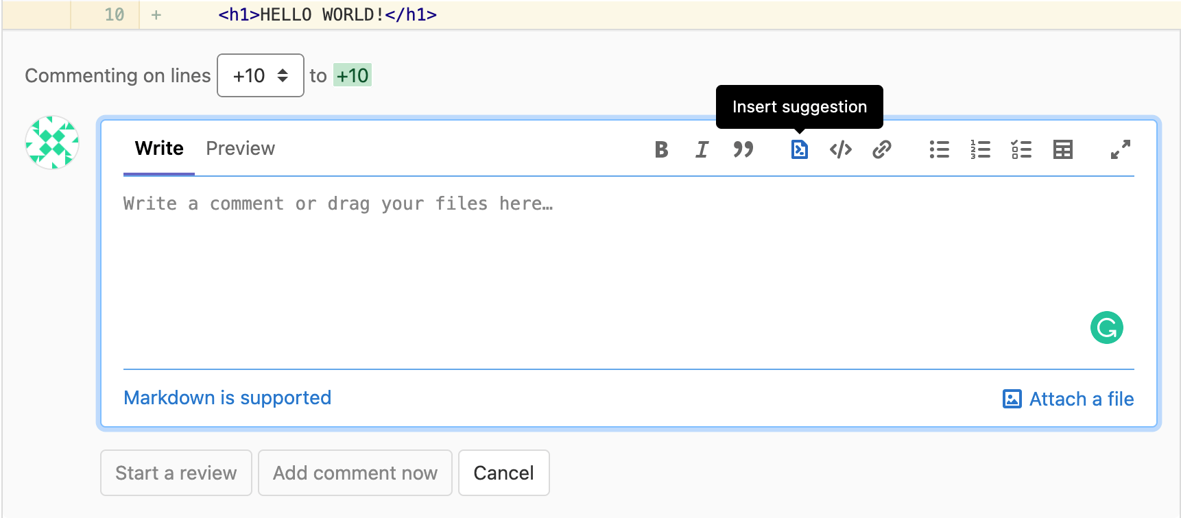 Choose a line of code to be changed, add a new comment, then select the Insert suggestion icon in the toolbar: